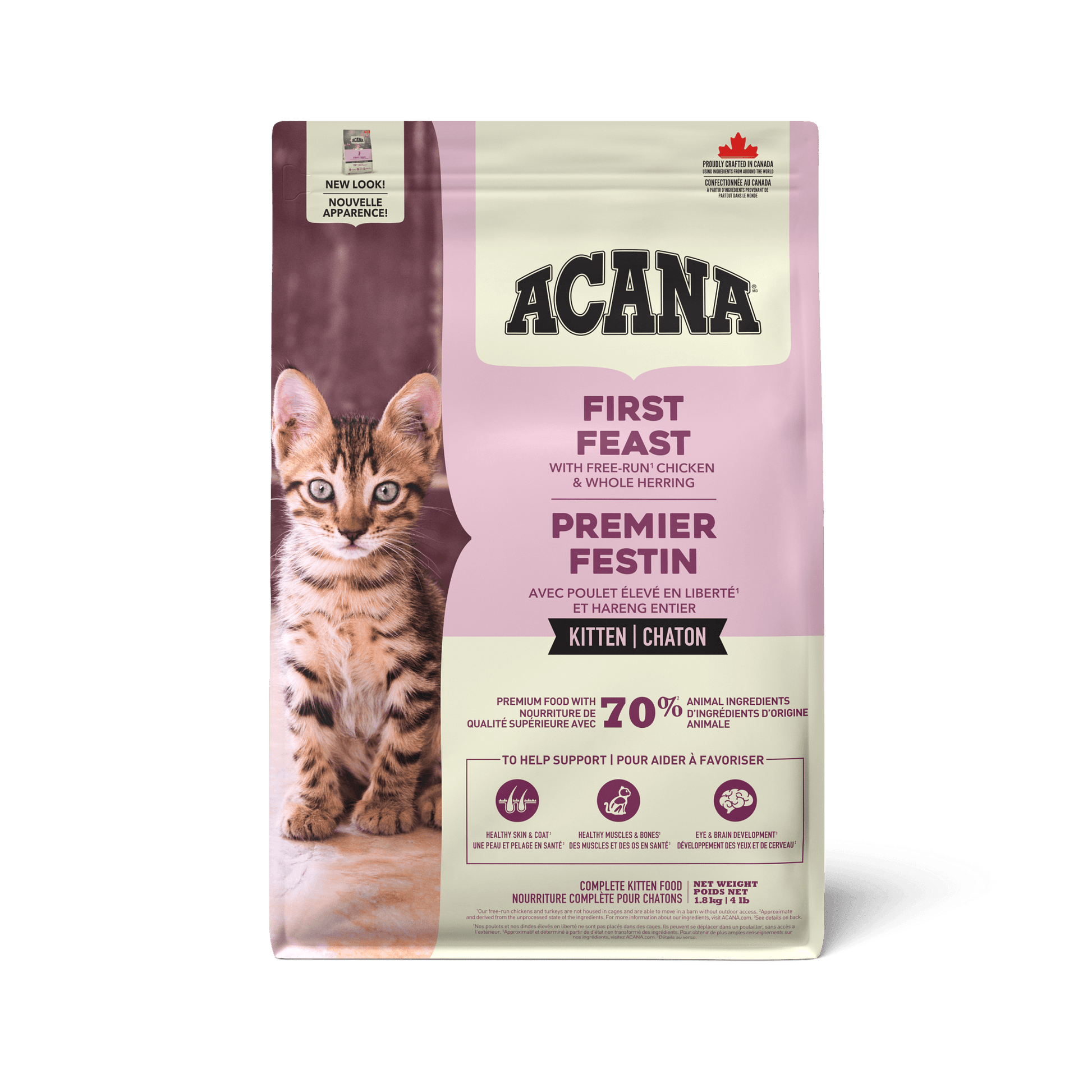 Acana's Premium Kitten First Feast Recipe is the perfect way to nurture your kitten’s growth and development. Loaded with 70% quality animal ingredients, including free-run chicken and herring, the nutrient-dense recipe offers protein for growth and health benefits such as a healthy skin and coat, strong muscles and bones, and eye and brain development. Give your kitten the best start with ACANA's First FeastRecipe.