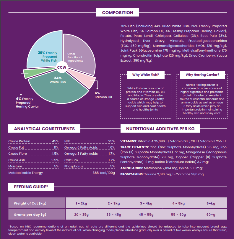 Adult Cats Unlike dogs, cats cannot synthesize all amino acids within their body and so it is essential that these are provided in the diet to maintain their health. To meet all the nutritional requirements of adulthood, adult cats require a high quality diet able to support their needs. Our complete recipes have been formulated with nutritionally balanced levels of vitamins and minerals to help maintain everyday health and wellbeing of adult cats