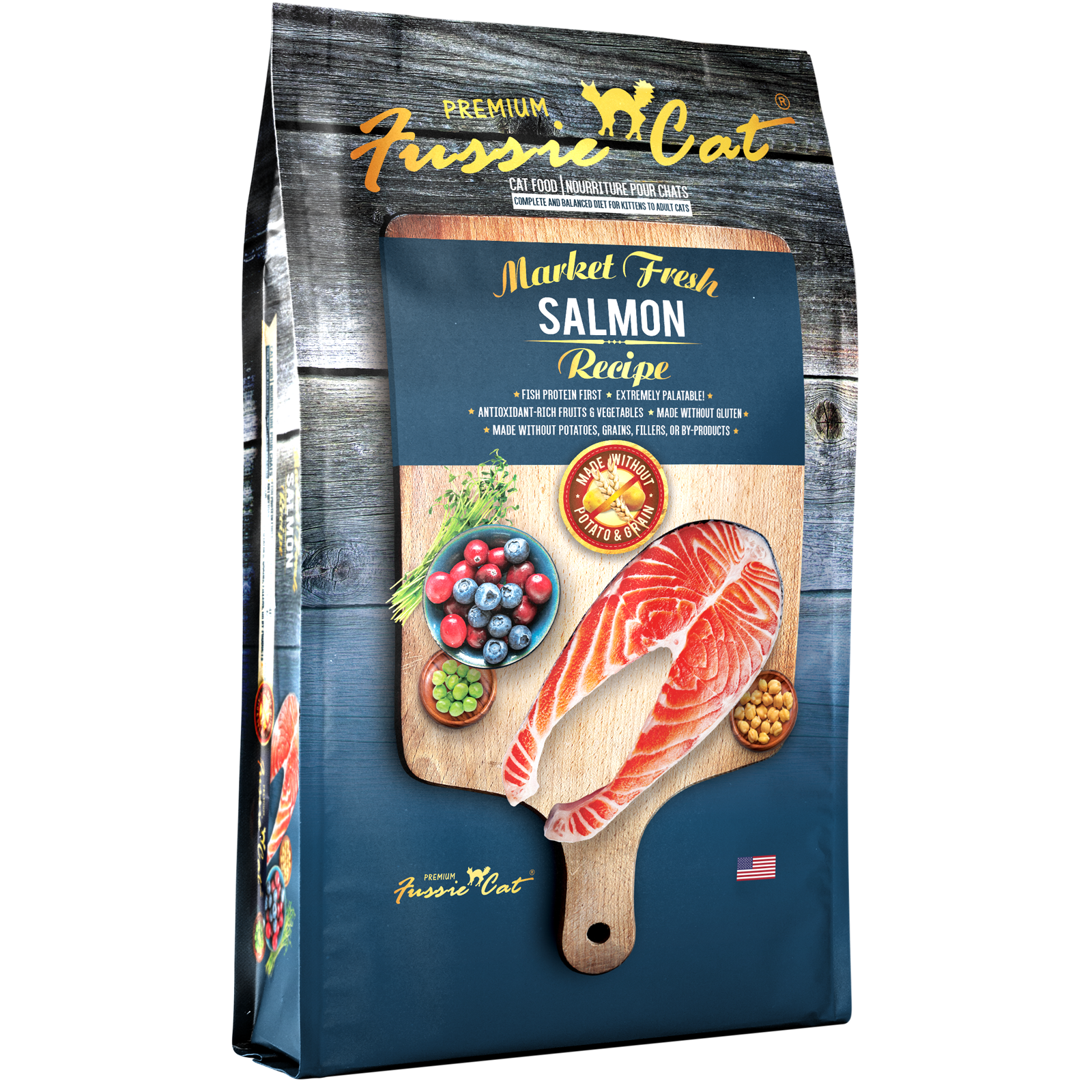 Ingredients: Salmon, Salmon Meal, Peas, Pea Flour, Chickpeas, Chicken Fat (Preserved With Mixed Tocopherols And Citric Acid), Catfish Meal, Natural Flavors, Whitefish Meal, Flaxseed, Chicken Meal, Alfalfa Meal, Calcium Carbonate, Kelp Meal, Choline Chloride, Salt, Fructooligosaccharide, Minerals (Iron Proteinate, Zinc Proteinate, Copper Proteinate, Manganese Proteinate, Cobalt Proteinate), Potassium Chloride, Taurine, DL Methionine, Blueberries, Cranberries, Vitamins (Vitamin A Acetate, Vitamin D3 Supplement, Vitamin E Supplement, Niacin, D-Calcium Pantothenate, Thiamine Mononitrate, Riboflavin Supplement, Pyridoxine Hydrochloride, Folic Acid, Biotin, Vitamin B12 Supplement), Lactic Acid, Calcium Iodate, Sodium Selenite, Rosemary Extract.