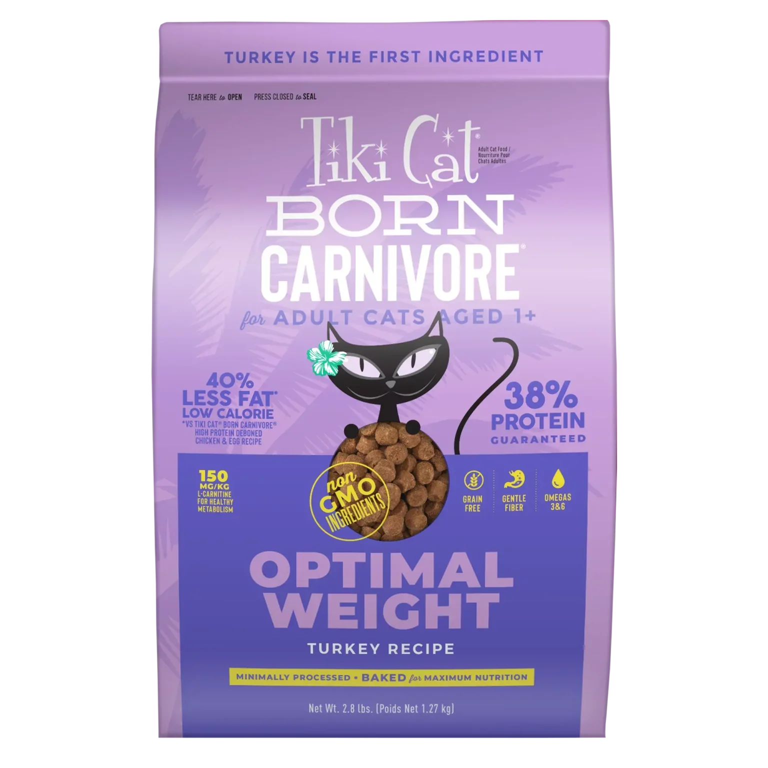 Some cats are less active or are prone to weight gain. Tiki Cat® Born Carnivore™ Optimal Weight can help cats achieve and maintain a healthy weight and good body condition. It is formulated with lower fat to limit calories, while still providing all the nutrients a cat needs in a highly-palatable diet.